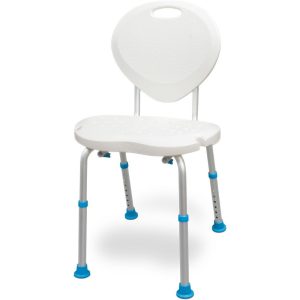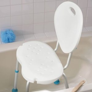 This contoured adjustable bath chair with backrest features a textured surface, drainage holes, seat handles, and slip resistant rubber safety tips. Adjustable legs raise or lower the seat height.