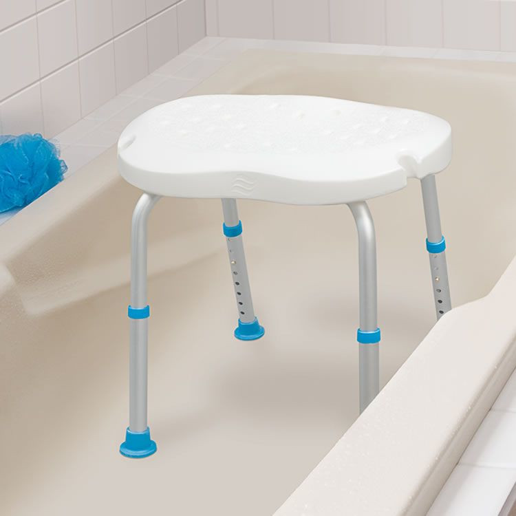 This contoured adjustable bath seat without a back, features a textured surface, drainage holes, seat handles, and slip resistant rubber safety tips. Adjustable legs raise or lower the seat height making it really ergonomic.