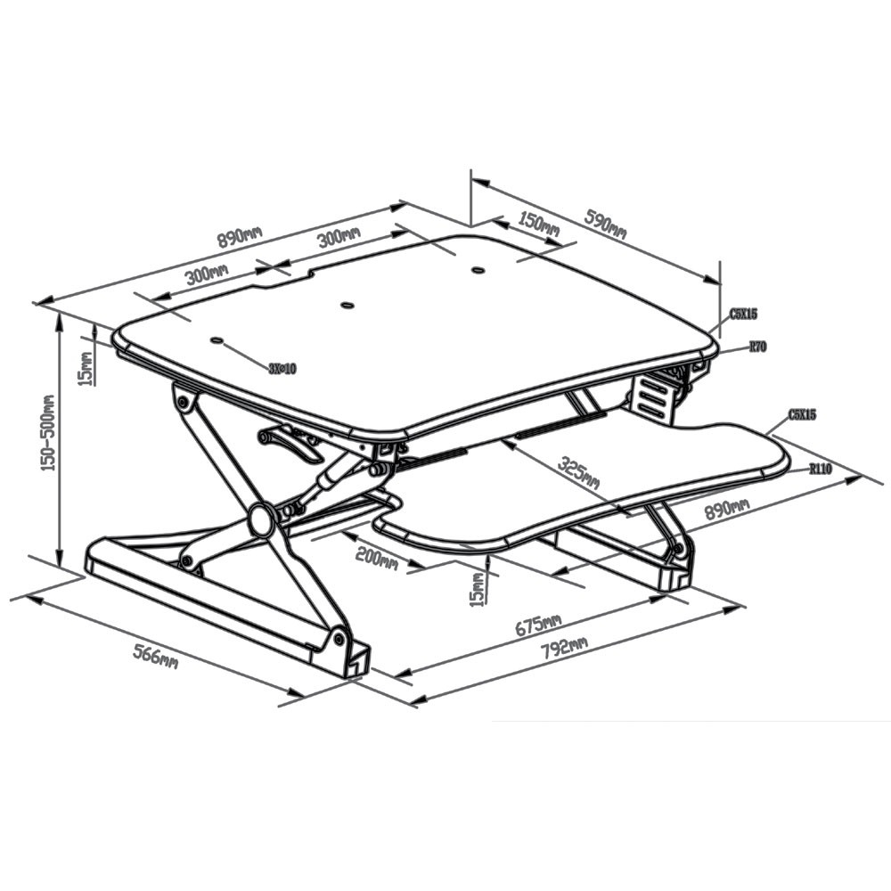 - Medium: 890 wide x 590 deep, and height range 150 to 500mm