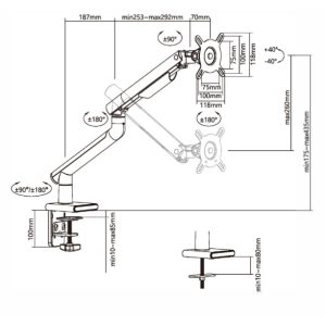 - Built-In 180° rotation stopper for confining the rotation to 180° by tightening the lower screw, which prevents interference with walls or desk partition
