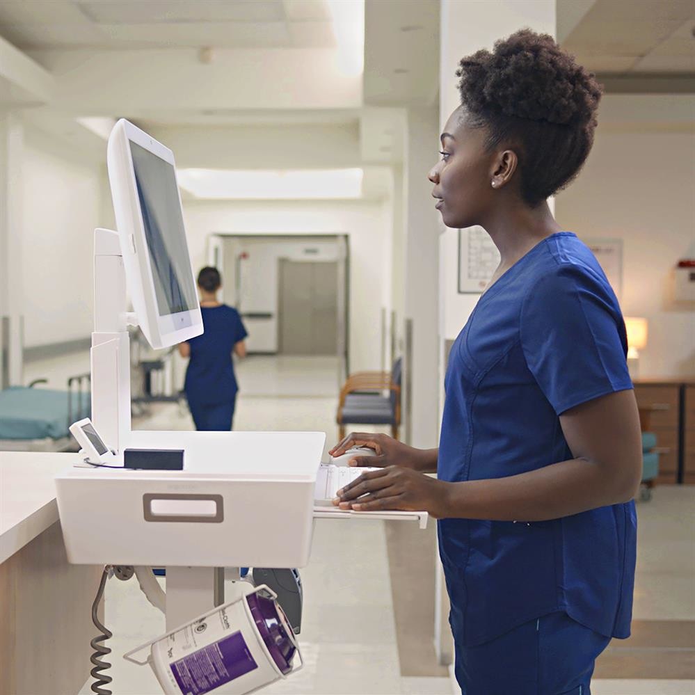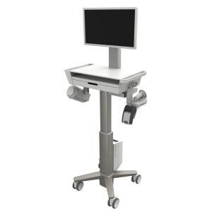 This is a super new Light-Duty Medical Cart from market leader Ergotron. The improved design of the lightweight CareFit computer cart fits your people, workflows and environments. The broadest range of caregivers can work comfortably with the expansive height range that adjusts to the ergonomic needs of each user. The leaner, compact frame makes it easy to move all-in-one computers and monitors weighing up to 20 lbs (9.1 kg). A large portfolio of accessories lets you customize the cart for your needs.