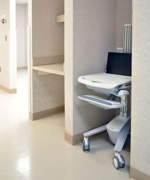 This innovative, truly ergonomic and easy-to-maneuver healthcare cart features sit-to-stand height adjustment and an adjustable back-tilt keyboard tray.