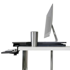- Keyboard tray can be positioned as low as 3.5" (9 cm) below desktop. For improved ergonomics when sitting or standing, the tray provides 3" (8 cm) of independent height adjustment to change the position of the tray relative to the unit’s work surface