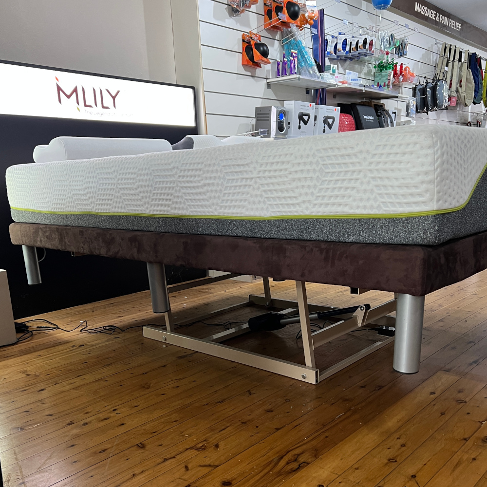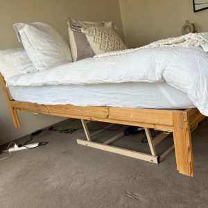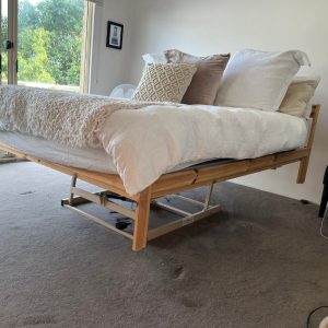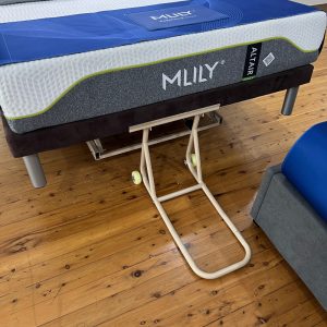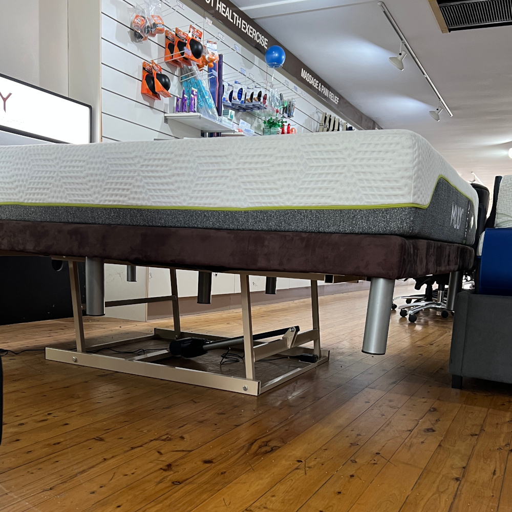 Lifts your bed waist height so you can make your bed standing up. Just plug in and push a button. Suitable for single, long single, double, queen, king beds up to 120kg. It best suits ensemble beds. Must have an 800mm clearance at the base of the bed and a minimum of 90mm leg height is required.