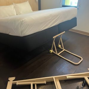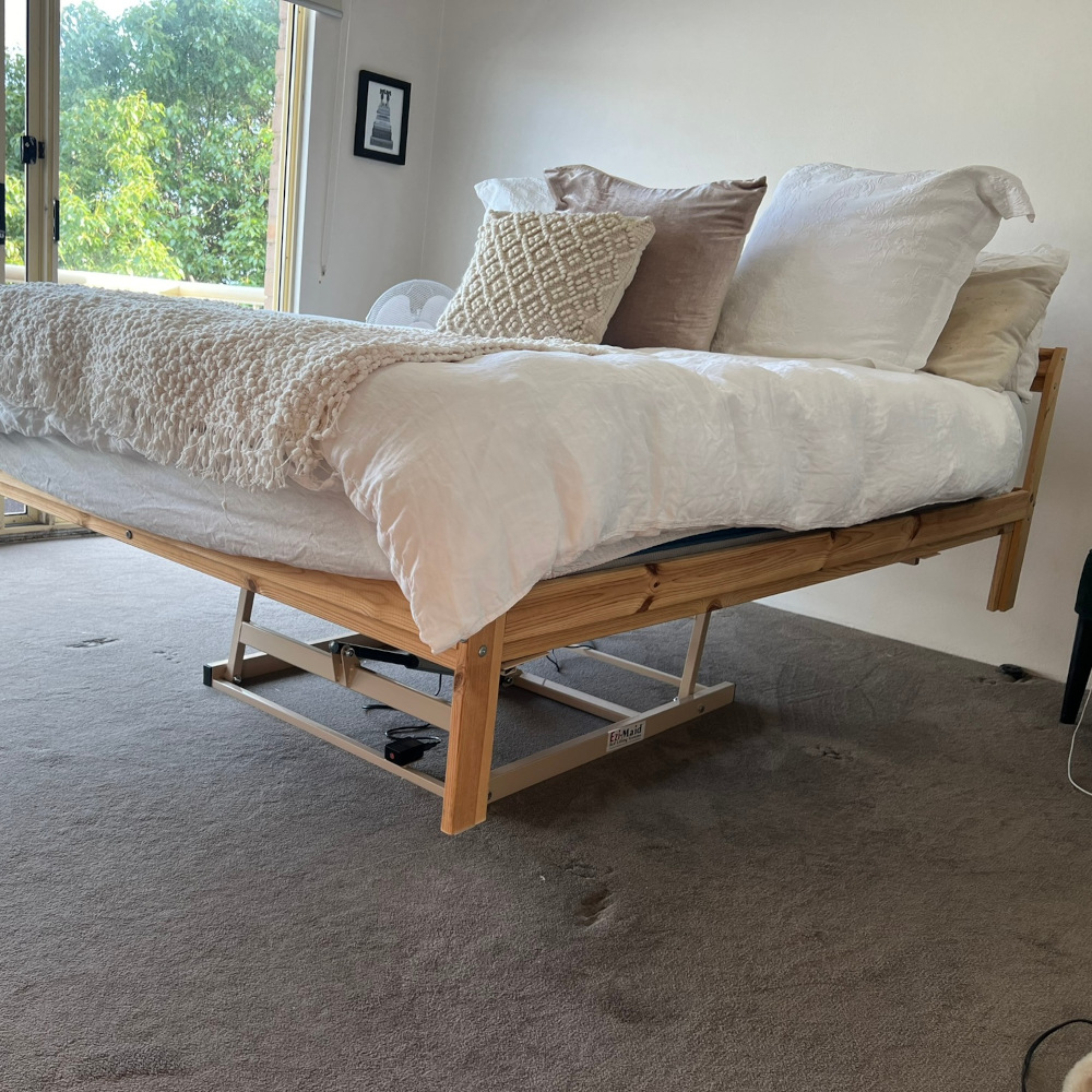The brilliant Ezi-Maid bed lifting system allows you to make your bed, change your bed sheets and vacuum under your bed without having to bend down and hurt your back. It lifts the bed up 500mm and away from the wall using an electric lift system controlled by remote, so it does all the heavy lifting for you. At Bad Backs now.