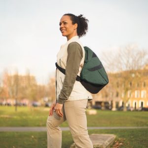 The Healthy Back Bag's teardrop shape distributes weight across the back rather than pulling from one point on the shoulder. The more places a bag touches the body when it is worn, the lighter it feels thus encouraging good posture.