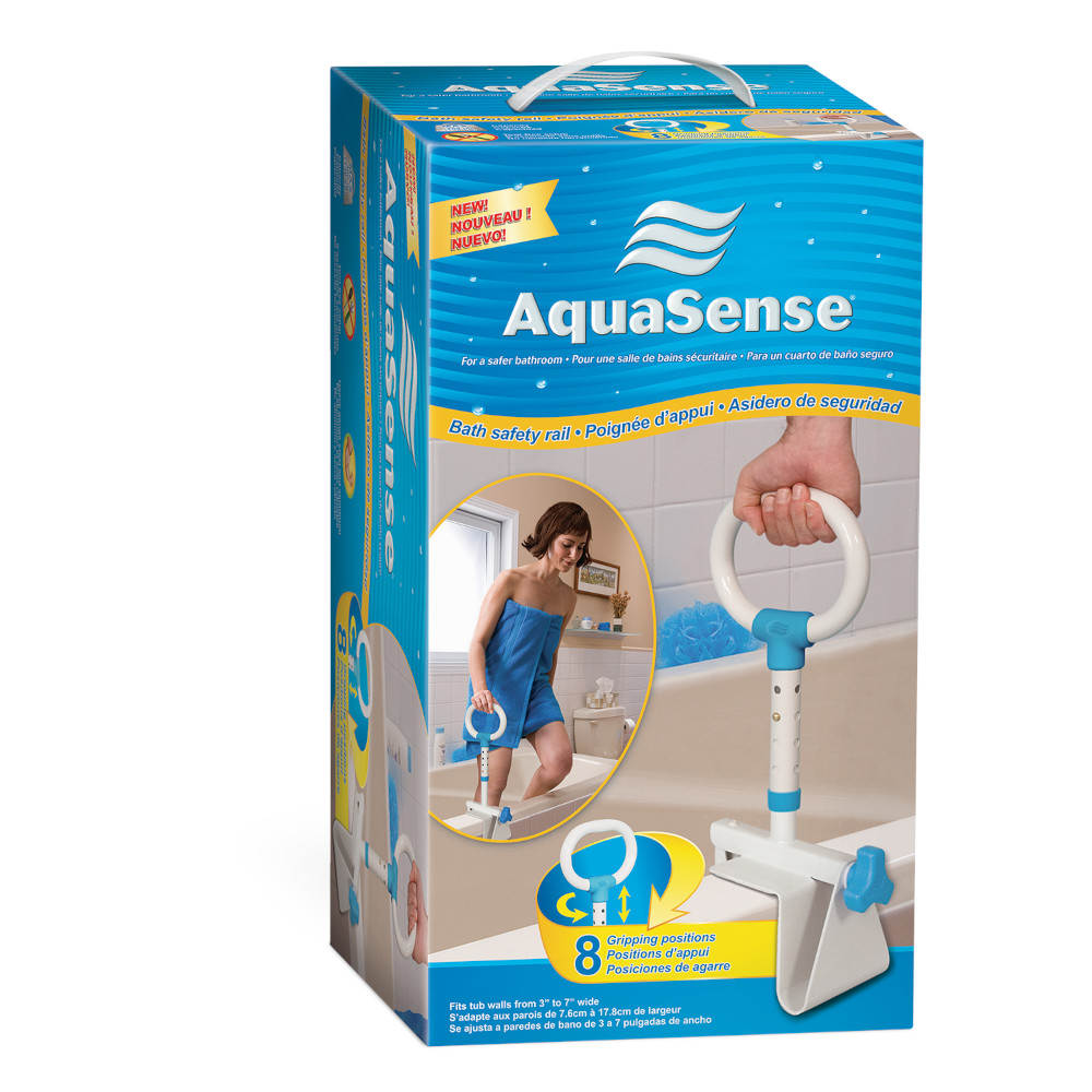 An excellent bath safety rail from bathroom safety experts AquaSense, providing security, stability and comfort when entering or exiting the bathtub.. It allows for both parallel and perpendicular orientation to the bathtub wall, and features four (4) different height settings.