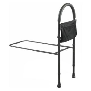 - The bed rail is held securely in place with a stabilizing base bar and rubber tipped legs.
