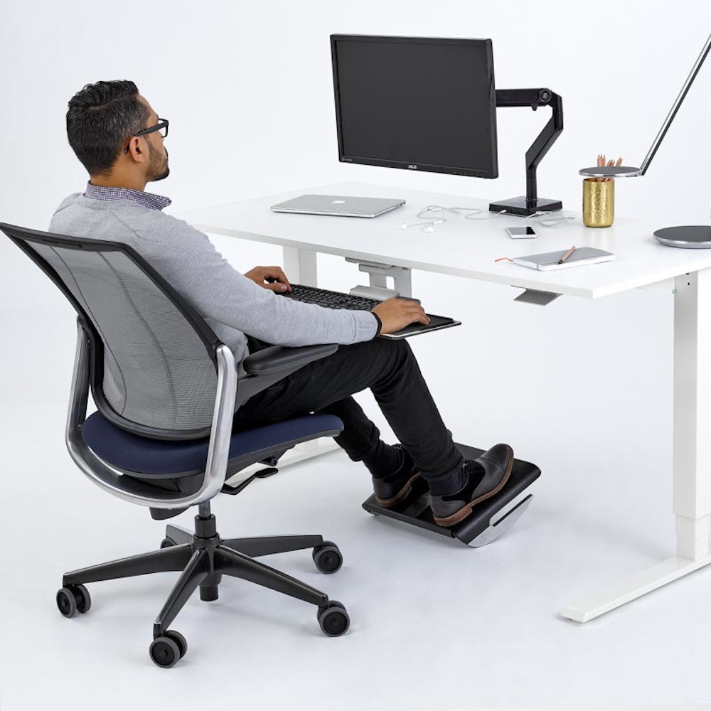 The award-winning Humanscale FR500 footrest delivers effortless functionality in a simple, stylish package. It encourages health and comfort by getting your feet moving. A great addition to your workstation that helps provide relief from prolonged sitting by encouraging a gentle rocking of the feet, providing perfect support for yourfeet and legs when sitting. By engaging lower leg muscles, it also raises your feet to relieve pressure on the lower back.