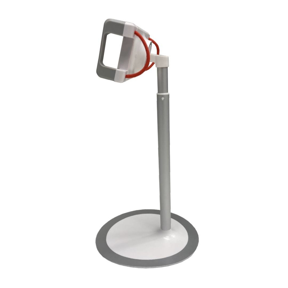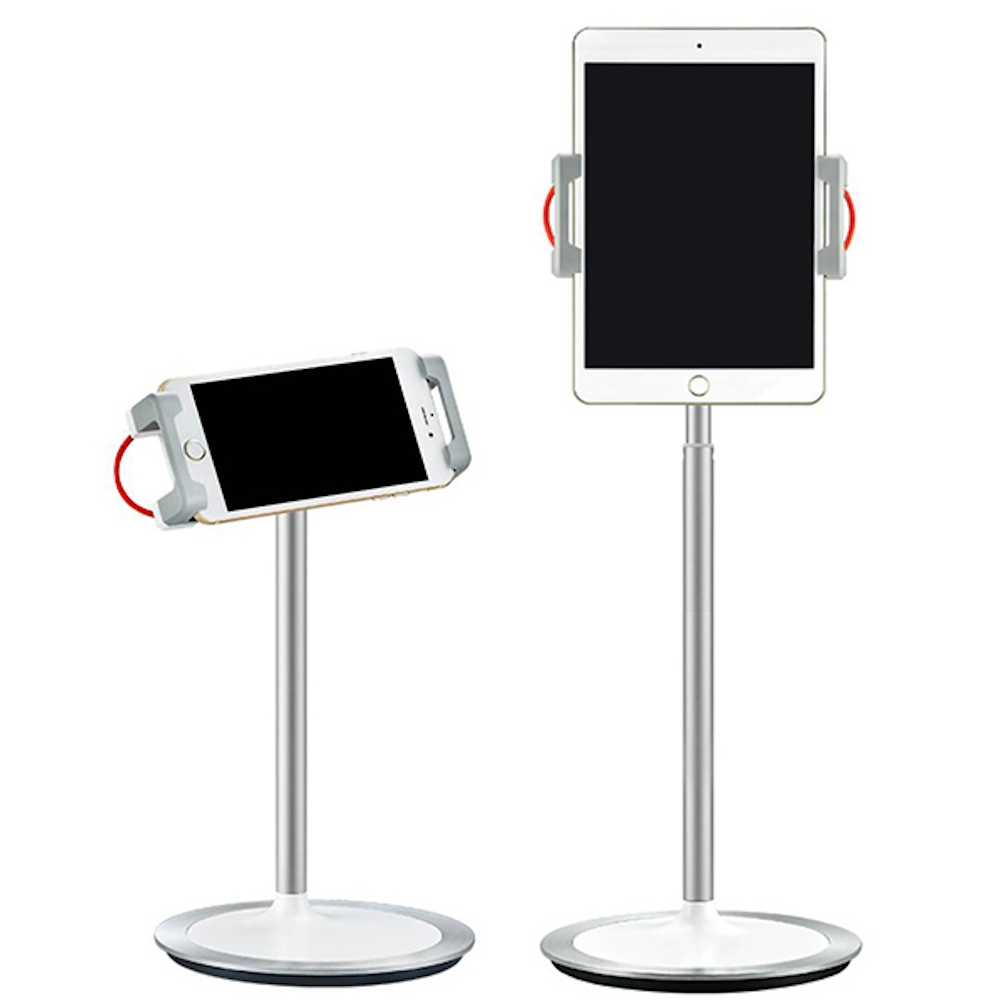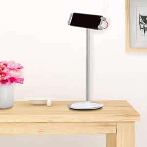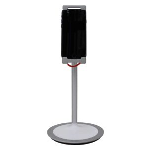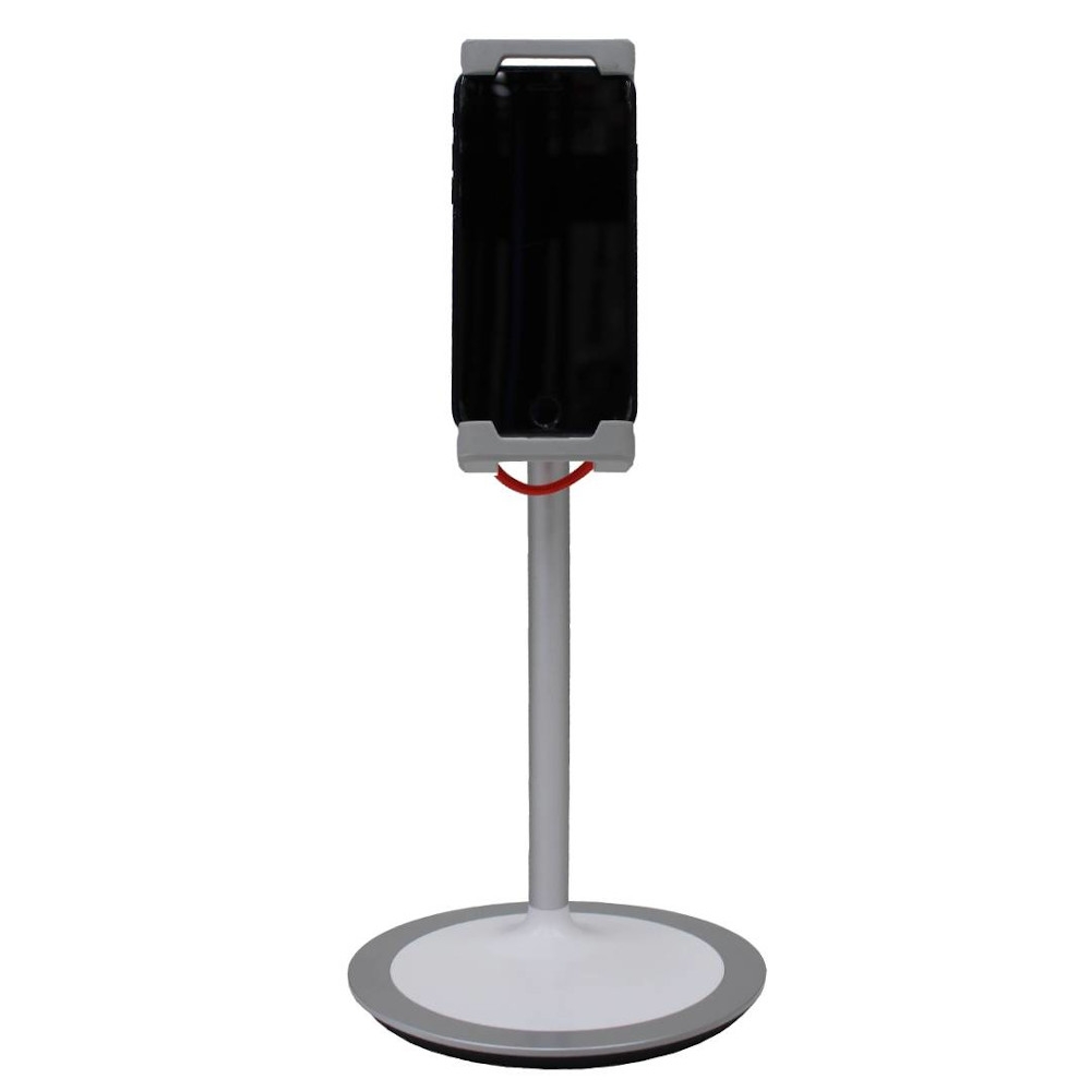 The Kari smartphone and tablet stand is a modern and simple accessory designed to hold a variety of smartphone and tablet devices on your desktop. It features a weighted non-slip base for stability, a height adjustable column at the rear of the base, and an adjustable clip bracket at the top of the column to attach a smartphone, tablet, iPad, Kindle or other similar device.