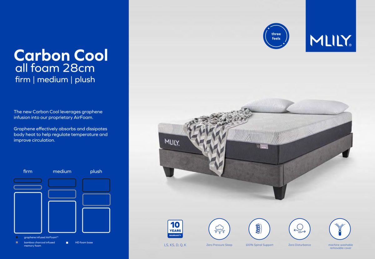 The new Carbon Cool MLILY Memory Mattress has graphene infused into the proprietary AirFoam, which helps absorb and dissipate body heat, regulating temperature and improving circulation. Made with an all foam construction, choose from three different feels, firm, medium and plush to get a perfect nights sleep.