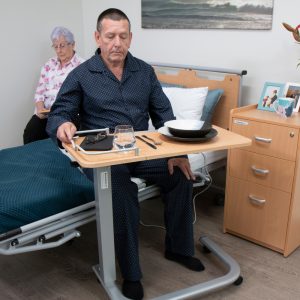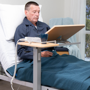 The PremiumLift Overbed Table comes with an antimicrobial table top and is designed with infection control in mind. The surface is non-porous and gap free, which eliminates areas for water to collect and bacteria to grow. The unique design has an Auto-lift mechanism allowing you to effortlessly raise the table top from any position. The table top will remain at the required position with no further adjustments and can be lowered by using the handle with no bending required.