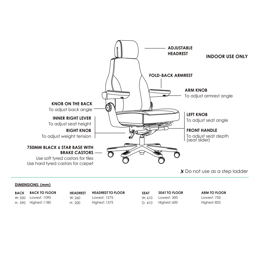 - Black high grade automotive leather on all contact surfaces, black PU on back and sides