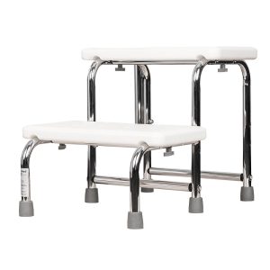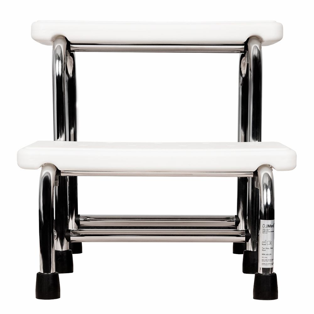 The DJMed Two Step Stool with Handrail is a double step stool with non-slip hand grips and the handle height can be changed based on your physical capability and range of motion.