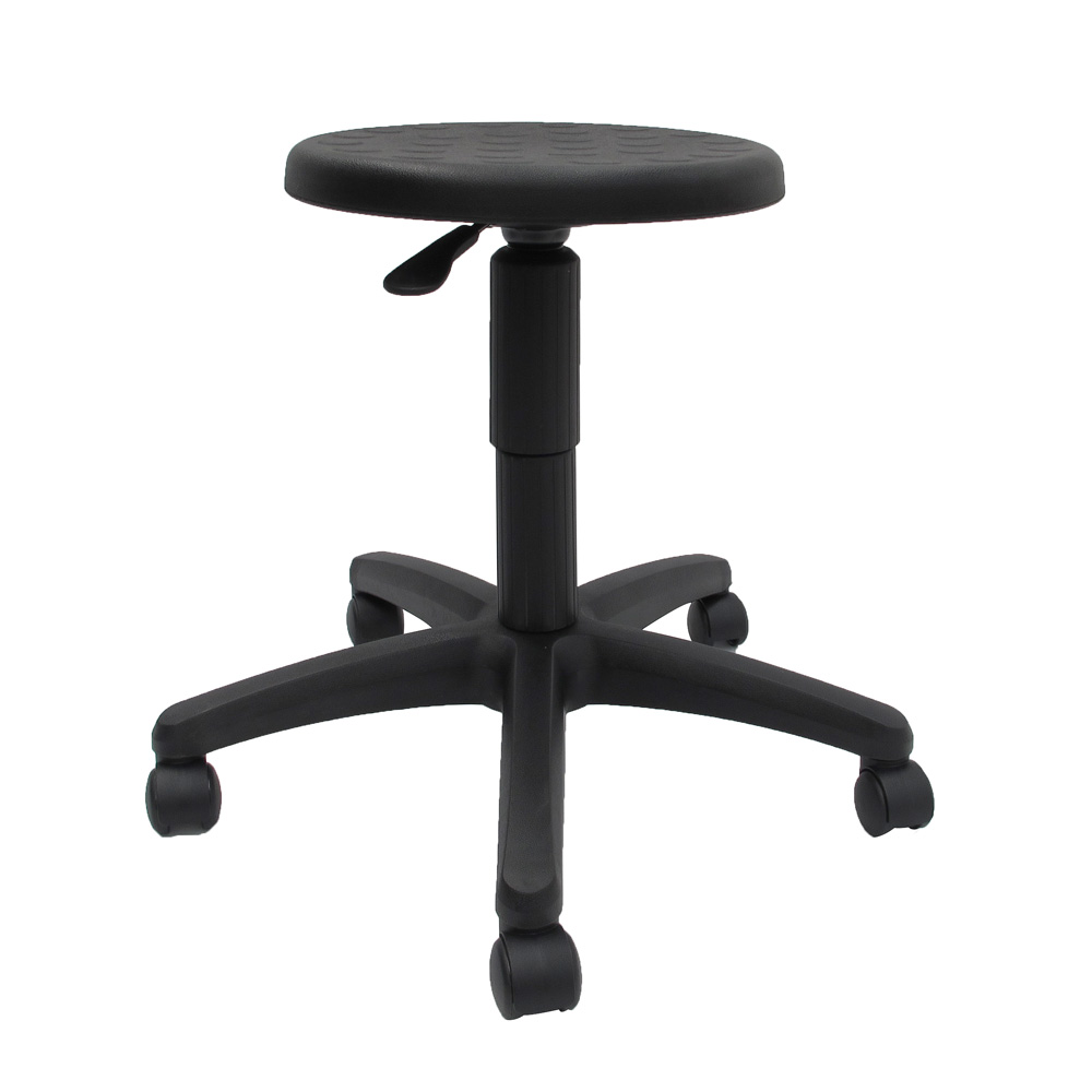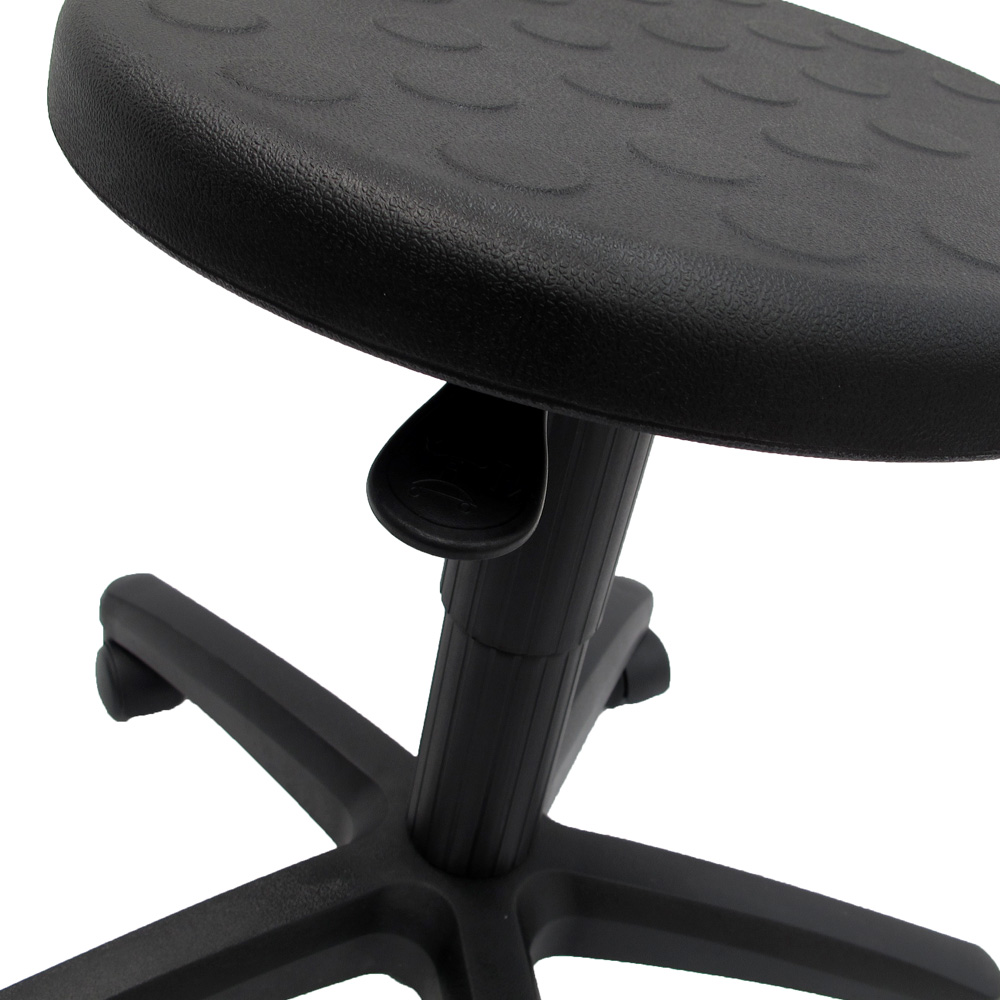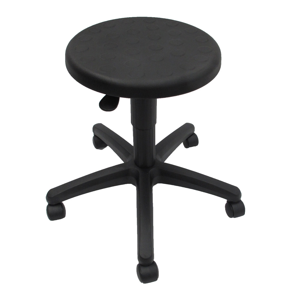 A simple round stool with a firm molded PU black seat. Easy to wipedown and clean. Hard wearing, it's perfect for any industrial, production, laboratory or workplace settings. No hidden seams for dirt and dust to collect. Water and static resistant.